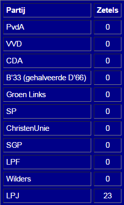 Grote overwinnaar lijkt de LPJ (Lokale Partij Jurgensland) te worden door wederom de absolute meerderheid van stemmen in de wacht te slepen.Met Burgemeester B. als lijsttrekker en Wethouder F. als lijstduwer lijkt deze partij een ijzersterk concept in handen te hebben.