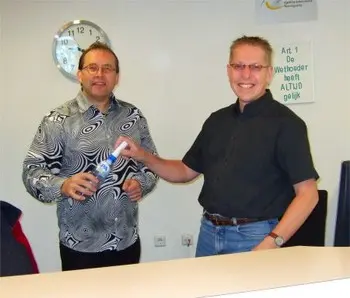 "Op het Gemeentehuis van Jurgensland zijn de voorbereidingen in volle gang voor de flessenpostwedstrijd: hier stopt Wethouder F. de eerste brief in een fles. Burgemeester B. ziet toe of alles correct verloopt."