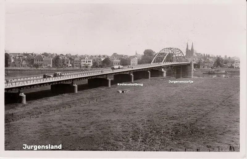 We zien de brug over de Kooiensloot en met enige moeite is het Jurgensmuurtje te onderscheiden, waarbij aan de hoogwaterschuif te zien is dat er geen hoog water in aantocht is omdat deze omhoog staat.